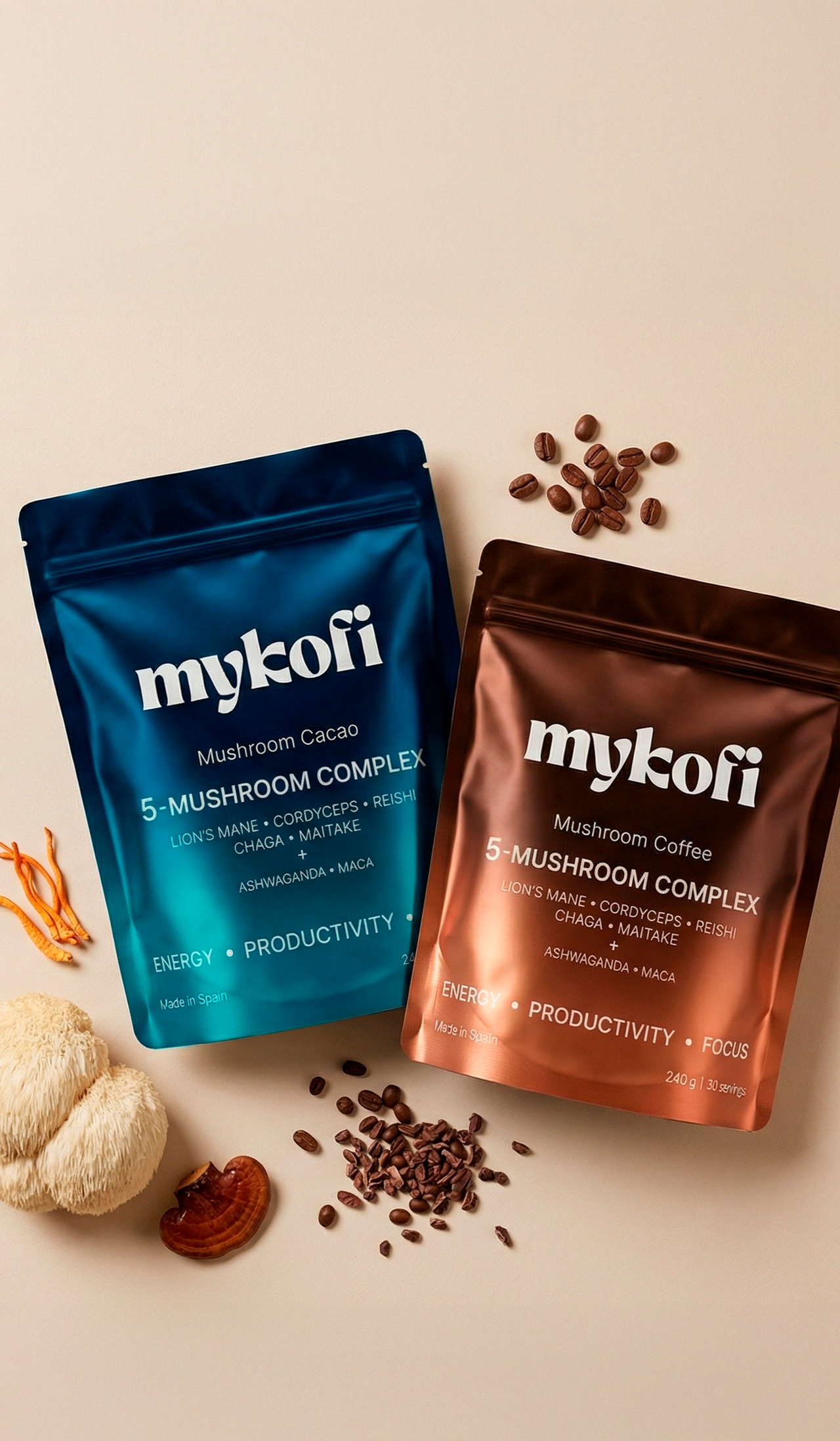 Each blend combines Lion’s Mane, Cordyceps, Reishi, Chaga, Maitake, Ashwagandha and Maca — carefully balanced for daily focus and calm energy.
