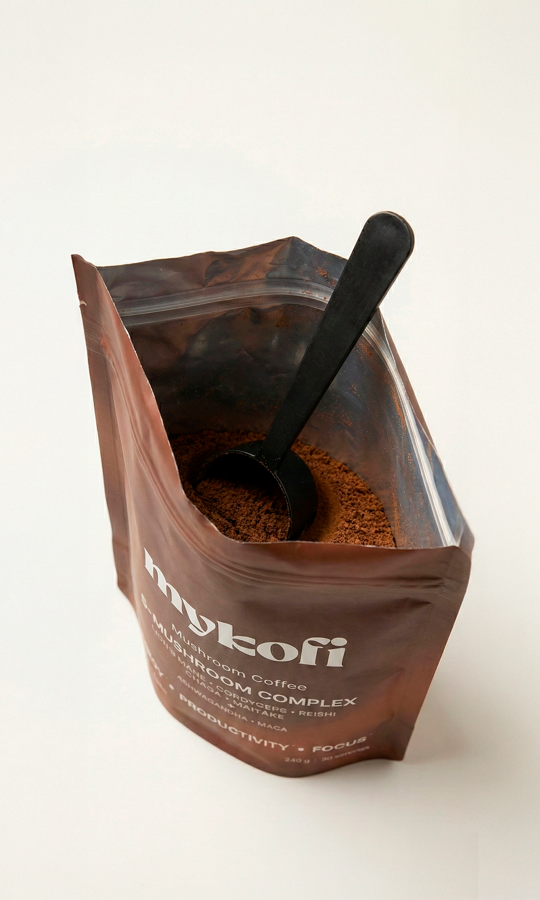 MYKOFI contiene 187 mg de cafeína de origen natural por porción de 8 g, procedente del café.